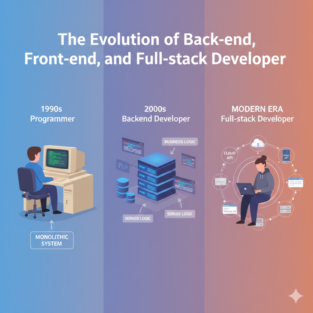 แนวคิดของ Backend, Frontend และ Full-stack Developer ไม่ได้เกิดจากการตั้งชื่อเฉย ๆ แต่เป็นผลจากการเปลี่ยนแปลงของเทคโนโลยี วิธีสร้างซอฟต์แวร์ และขนาดของทีม